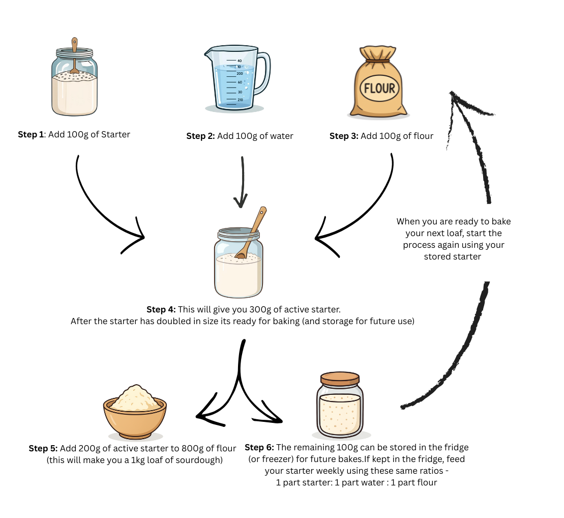 Once you've followed the steps below, fed your starter and it has doubled in size, you're ready to bake.